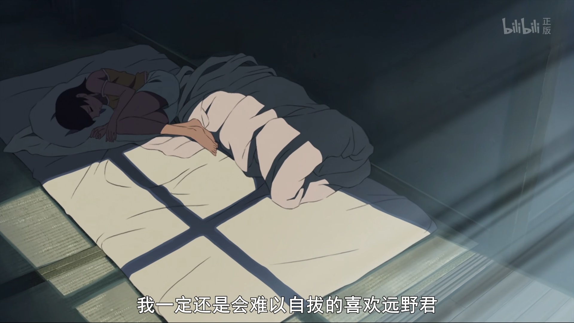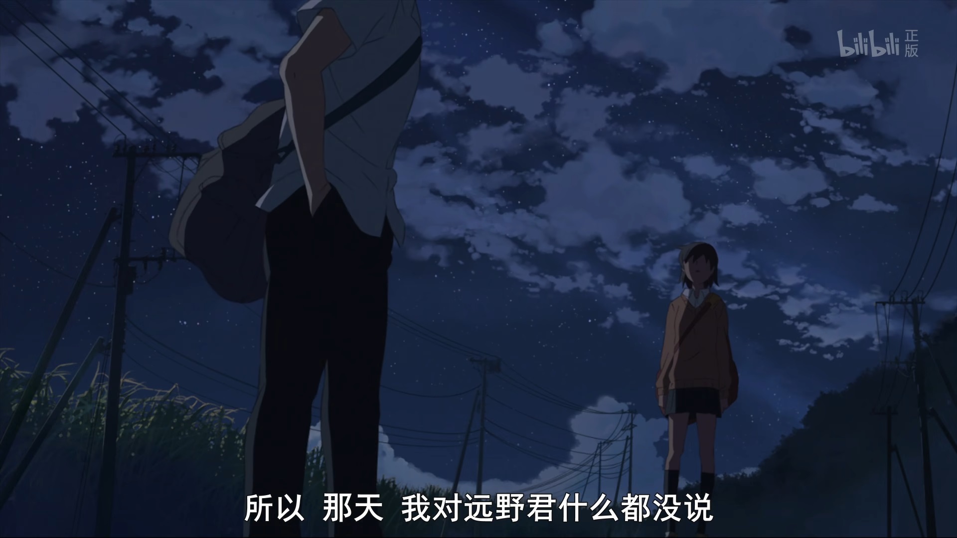 这一段说实话,很美也很虐。我是很希望男主能接受花苗。但没办法,爱情有时就是这么矛盾与残酷。男主一心想着异地的初恋明里,回想着自己勇敢孤身踏上见她的漫长充满坎坷的路途,回想着明里在大雪中车站独自等待到深夜,以及那胜过千言万语的一吻。其实这一段也是蛮感人的。男主与明里真是青梅竹马、知己知彼,天生一对、互相念想着对方。却由于异地这份念想只能借着美好的回忆成为一种执念,执念能够走到一起,然而时间考验着彼此,此时身居异地的男主就像当时大雪中孤单无助的乘坐在被困在大雪中等待着继续前行的列车中,那时男主说过一句话:“明里 如果你已经回家了…就好了”。这里既反映出男主不愿放弃、一心想早点见到明里,却无奈无法控制天气,只能干等着,另一方面又不想让女主因为他而久等,担心、不安。花苗并没能让男主产生爱意,只是温柔,因为男主一心想着远处明里,等待着命运的列车能继续前行,让自己与明里相见。