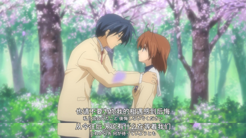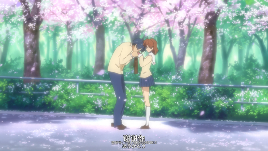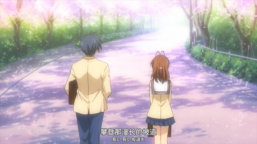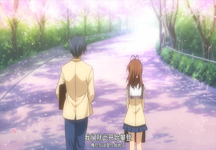 第二季第九集“坡道的途中”是一个重要的分水岭。动画第一季到第二季第九集,是男主朋也的青春学校生活,主要是其与包括女主渚在内几位妹子的互动(风子、琴美、一半的智代线、古河家,春园兄妹、美佐枝、纪宁、(藤林杏椋动画里只有出现部分,游戏里是表达了妹妹温柔的爱、姐姐感性的爱以及姐妹间的爱护)),帮助她们收获幸福,收获了光粒。这部分内容很校园,部分情节相当搞笑,有时甚至让人感到有种后宫番的感觉(除了渚其她妹子都同一时刻、不约而同来给男主送饭,这一段太搞笑了)。几个线的刻画也挺感人的,风子不懈的努力让姐姐婚礼美满,姐姐放下一切守候妹妹;琴美父母在最后时刻放弃了对科学的追求而是选择了祝福自己的女儿,那个各国陌生人间不断传递的箱子;早苗秋生为了孩子放弃了自己的梦想,孩子的梦想就是自己梦想,孩子的幸福就是自己的幸福;古河渚在男主的帮助与自己的努力下实现了重建话剧社的小心愿,自己也有所成长,不再胆怯,主动表达自己的想法情感,最后与朋也走到了一起;美佐枝中合二为一的祈愿非常童话与浪漫;春园兄妹间的保护与关爱与纪宁治愈的微笑,可能是没有代入,感触不大,不过其中也是有美好情节的,平原与朋也基友间的默契与信任、渚对平原妹的照顾、纪宁的坚强与信念、渚对朋也的报答以及古河夫妇的各种帮助支持。这才是真正的爱情,不是你侬我侬,而是之间的相互帮助、信任、依靠、体谅、倾诉、理解、真爱、成长(想想看整剧都没有什么亲热的镜头,全剧差点一次接吻还是另一个世界藤林,与渚的最亲密拥抱还是在坡道上那个最重要的选择时刻)。